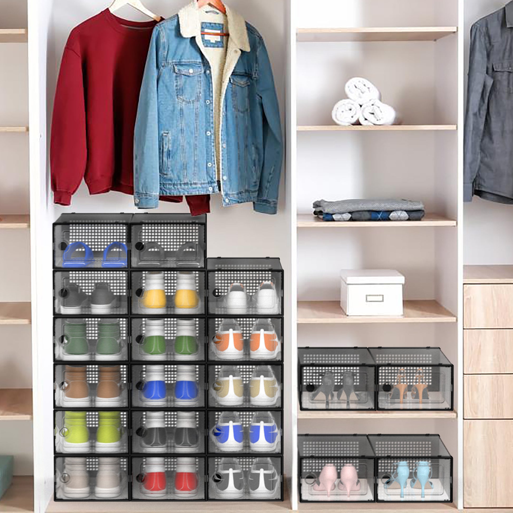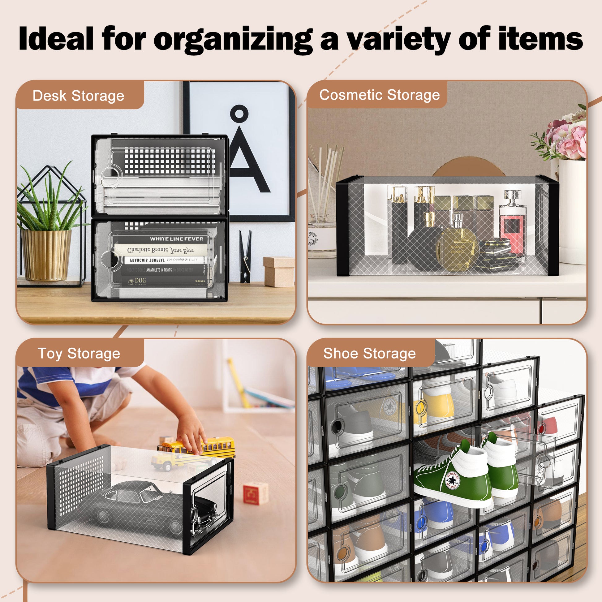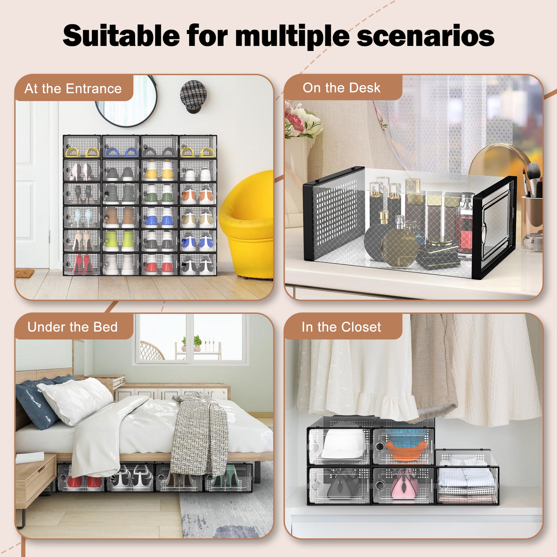 - Say Goodbye to Mess: 24 Pack Black Stackable shoe storage boxes amazing for dust free and maximizing storage space. You can place our shoe storage container in closets, entryways, bedrooms, bathrooms, laundry rooms, craft rooms, offices, playrooms, etc. to organize your shoes or other things.