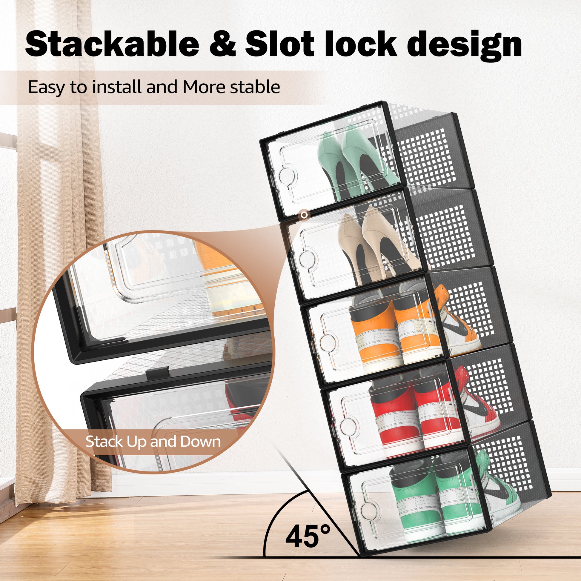 - Easy To Assemble & Sturdy: The slot lock design of these shoe boxes allows for effortless assembly and stacking. Simply "insert and push" to securely stack the shoe rack organizers together. This design ensures stability for free combinations and easy relocation. Say goodbye to wobbly shoe racks and enjoy a stable and organized shoe storage system.