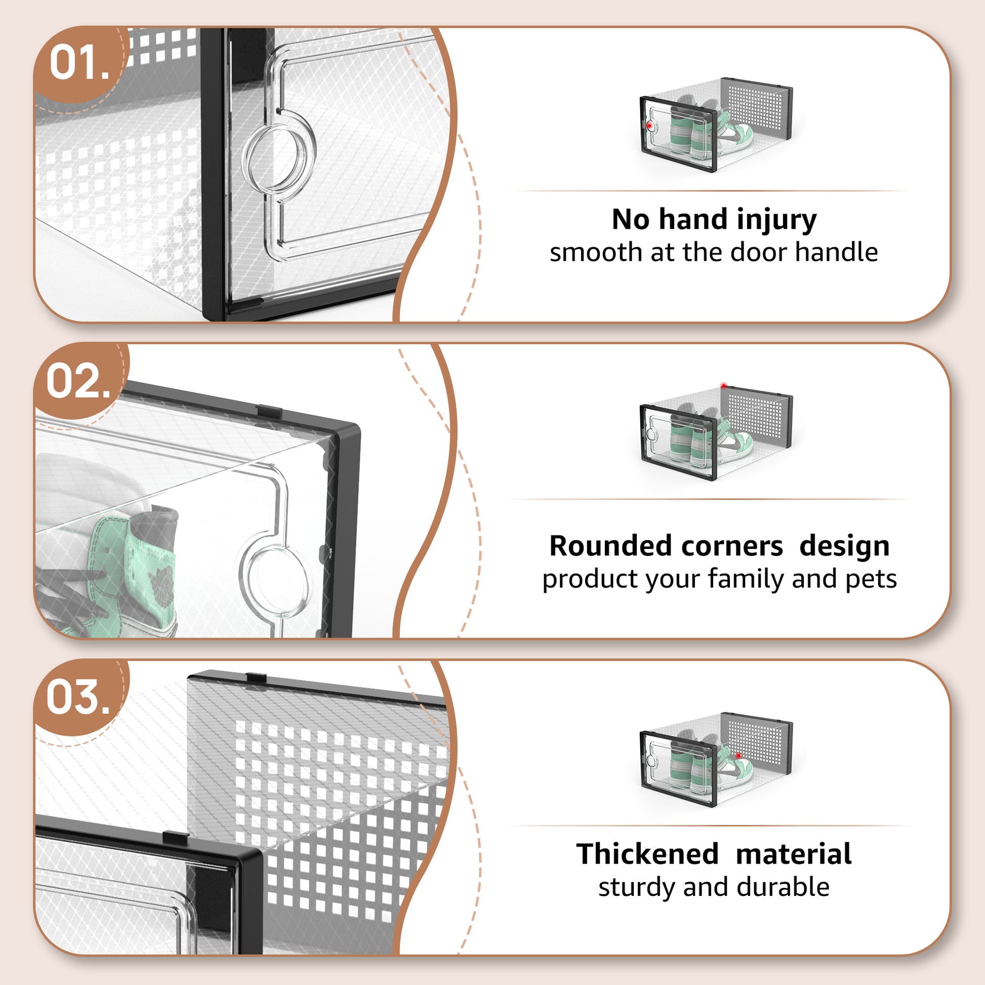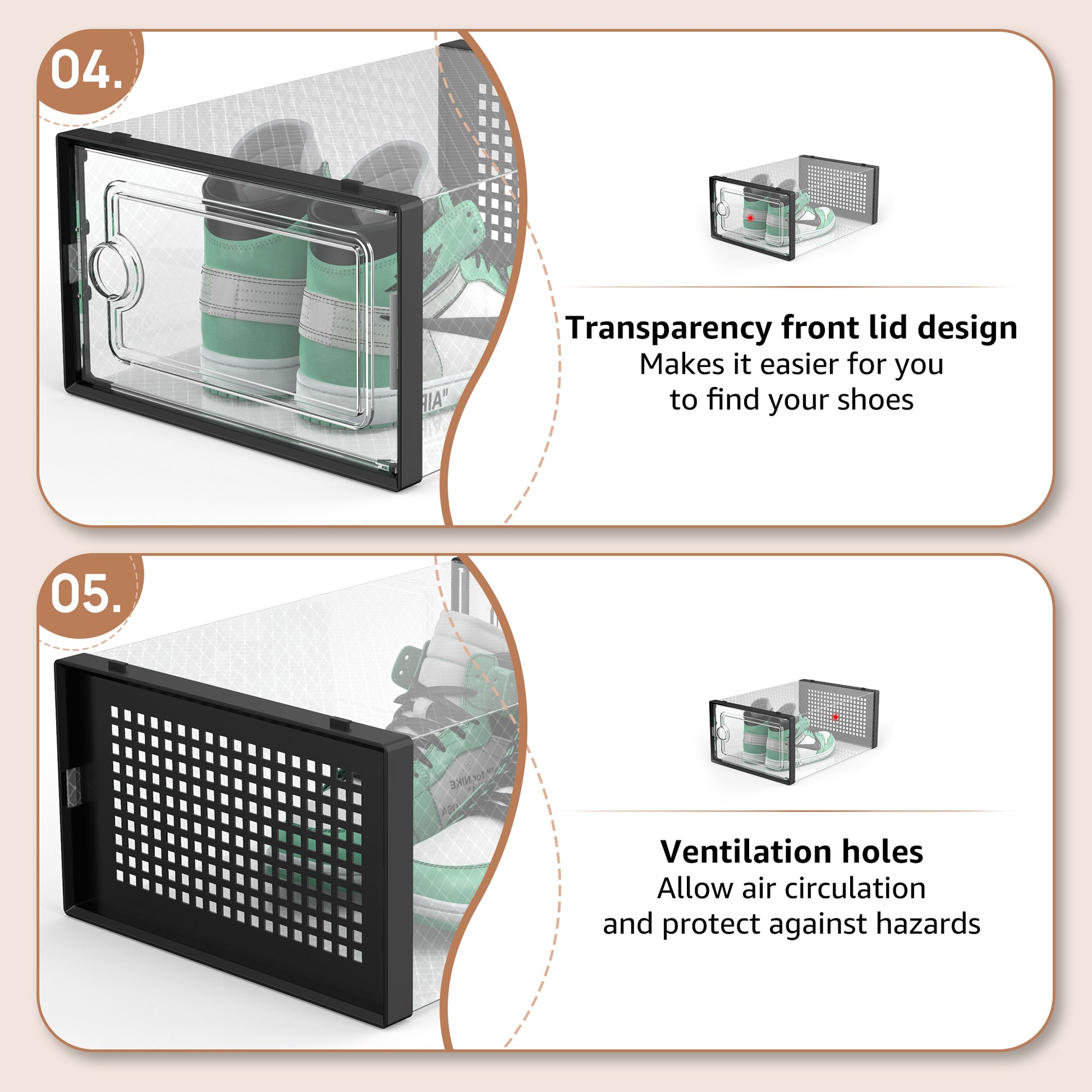 - Keep it Clear & Ventilation Design: The transparent plastic material of these waterproof shoe boxes makes it easier for you to locate and access your shoes. The smooth door handle design ensures effortless opening and closing without any risk of injuring your hands. Moreover, the back of each shoe organizers features ventilation holes, promoting air circulation and preventing odors. Your shoes will stay fresh and well-ventilated, even during long-term storage.