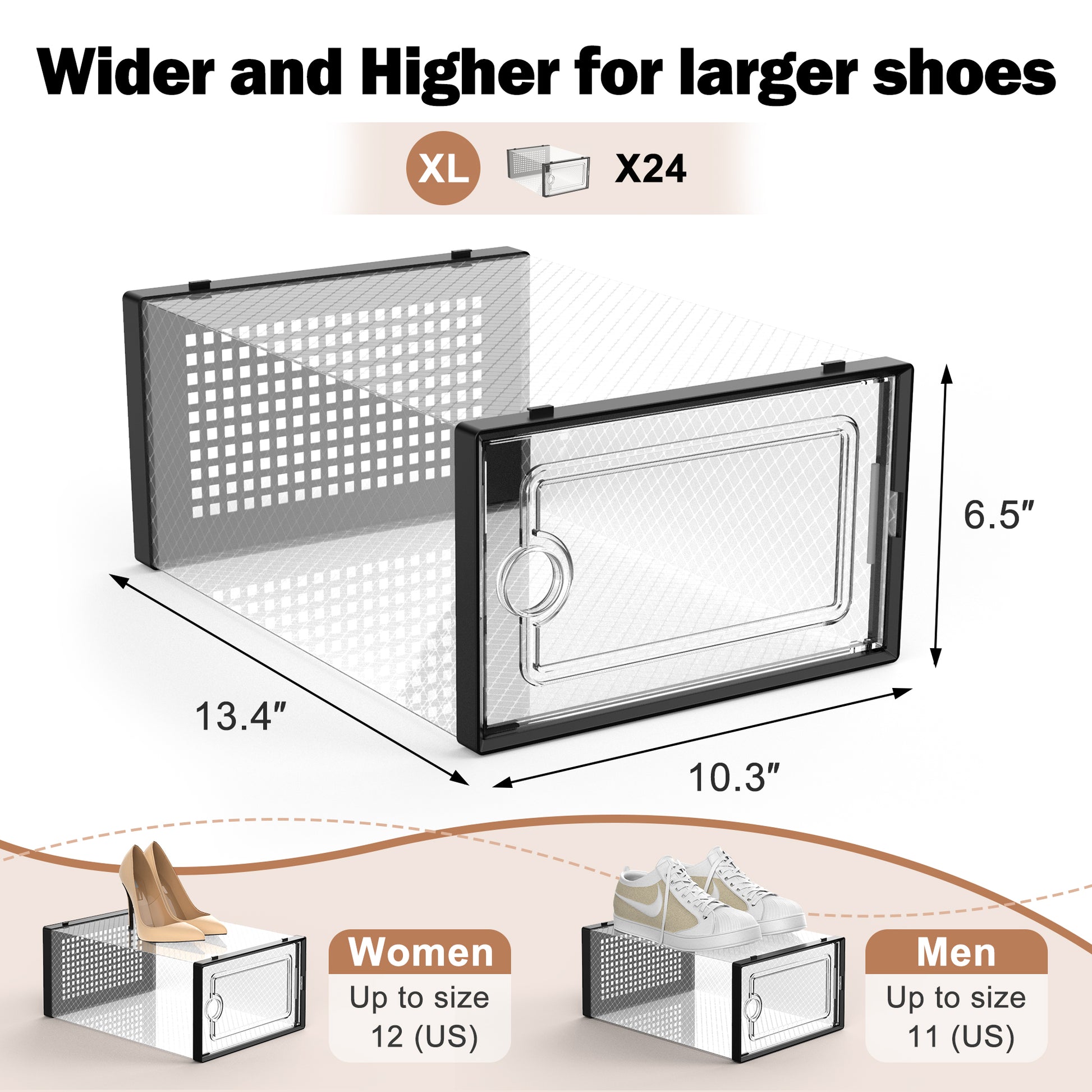 Wider & Larger for Capacity: The X-Large shoe organizers is 13.4"L x 10.3"W x 6.5"H. Provide a storage space for various types of shoes up to US size 12; Heels, flats, sneakers, flip flops, sandals, wedges. All types of shoes in closets, entryways or hallways are welcomed in these shoe containers.