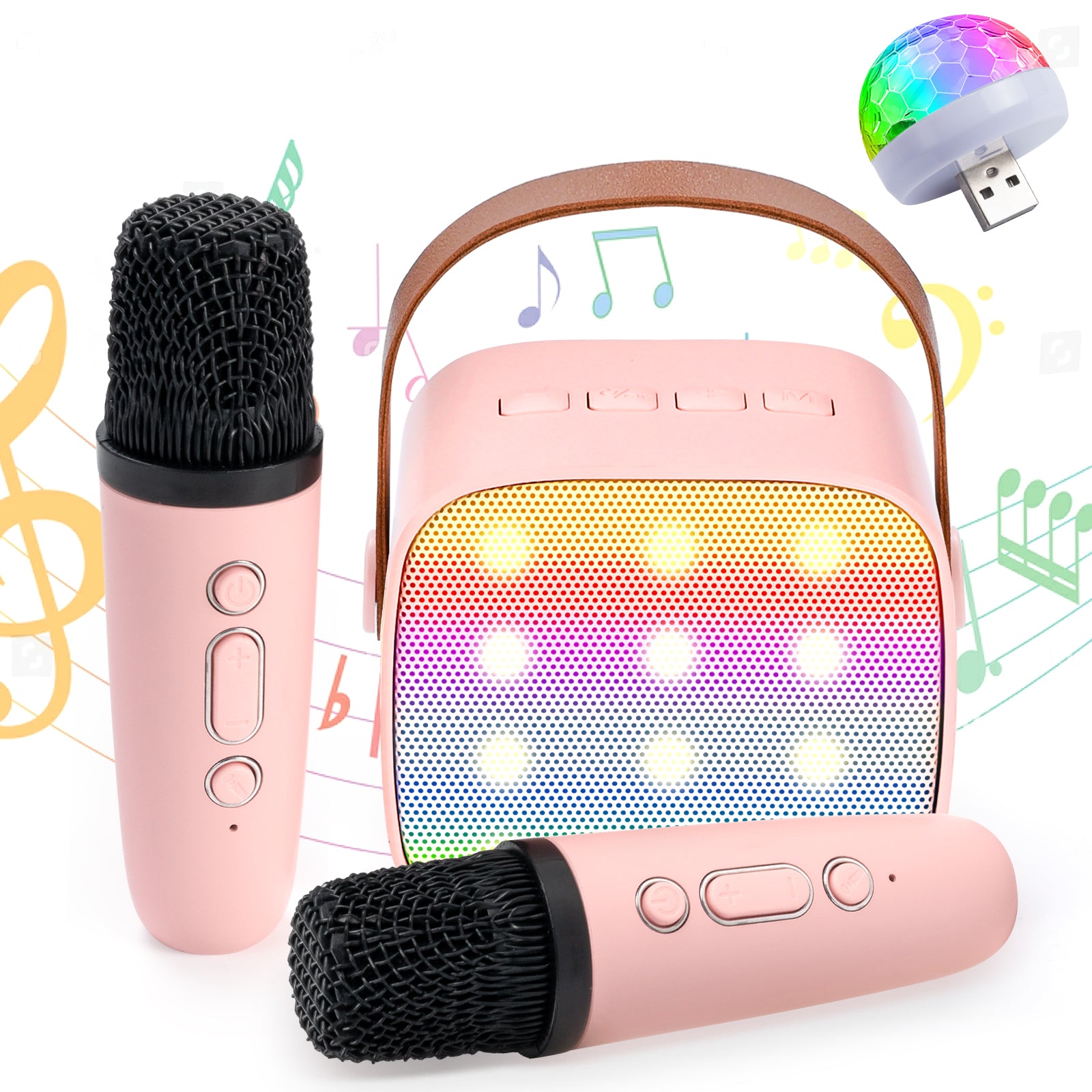 JakMean mini karaoke machine, portable speaker, music player and party lights all in one! Compact size with a built-in handle strap so you can take it with you wherever you go. The sound quality is clearer, more three-dimensional and more balanced, ensuring that you can enjoy a musical feast at any time. Our karaoke system builded with 5 voice mode and RGB light show, it is easy to attract children to sing and dance to the music, fun at all times. This portable Bluetooth speaker with 2 karaoke microphones so that kids can share with friends or family. With multiple connectivity, you can stream songs over Bluetooth, AUX-in port, or TF card. 6 hours long-lasting playing time, enjoy a long party time. This portable speaker is made of high quality material, durable and drop-proof. Great for children/adults birthday gifts and Christmas gifts.