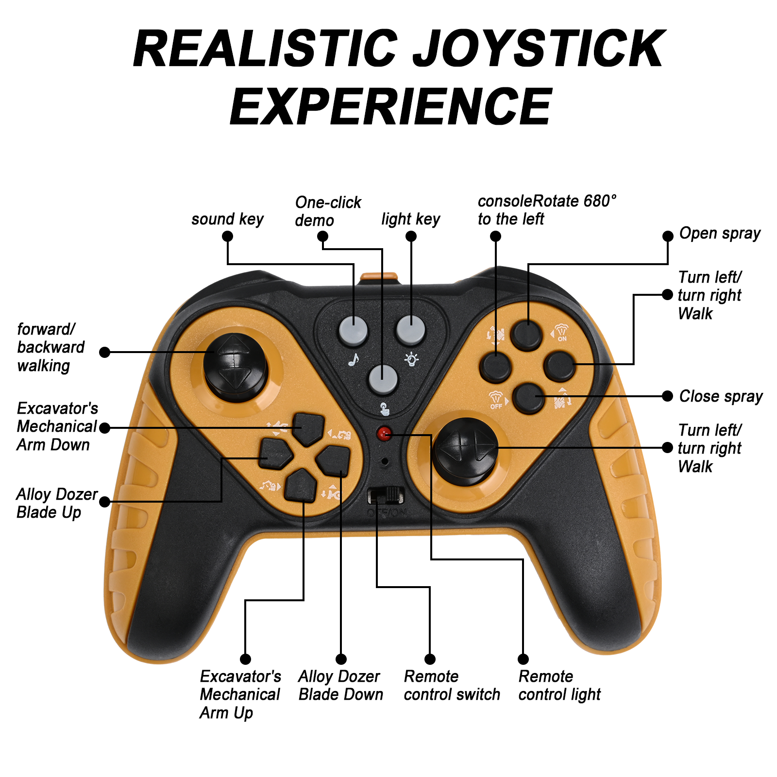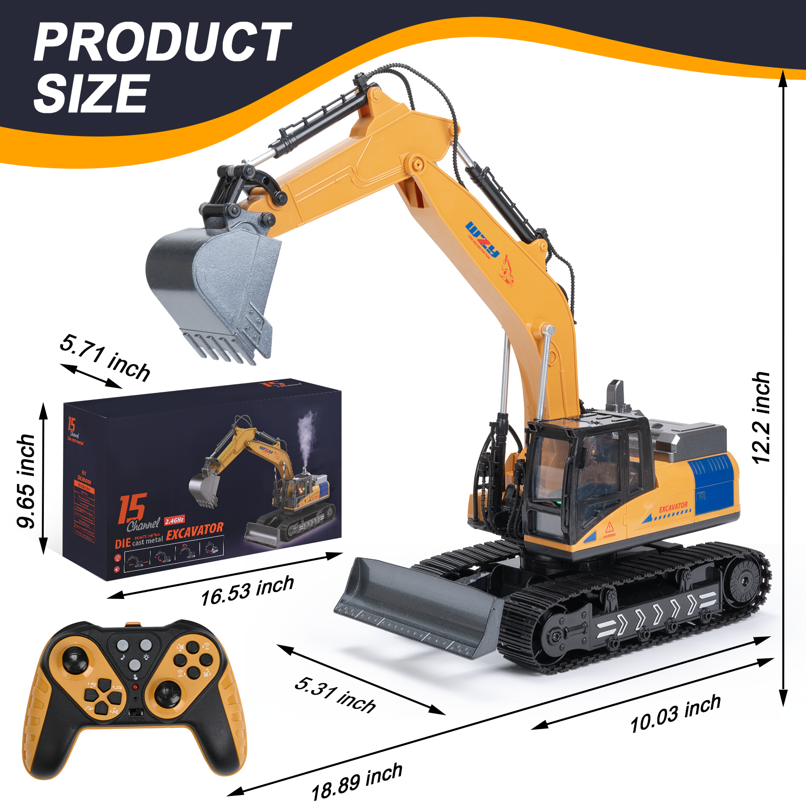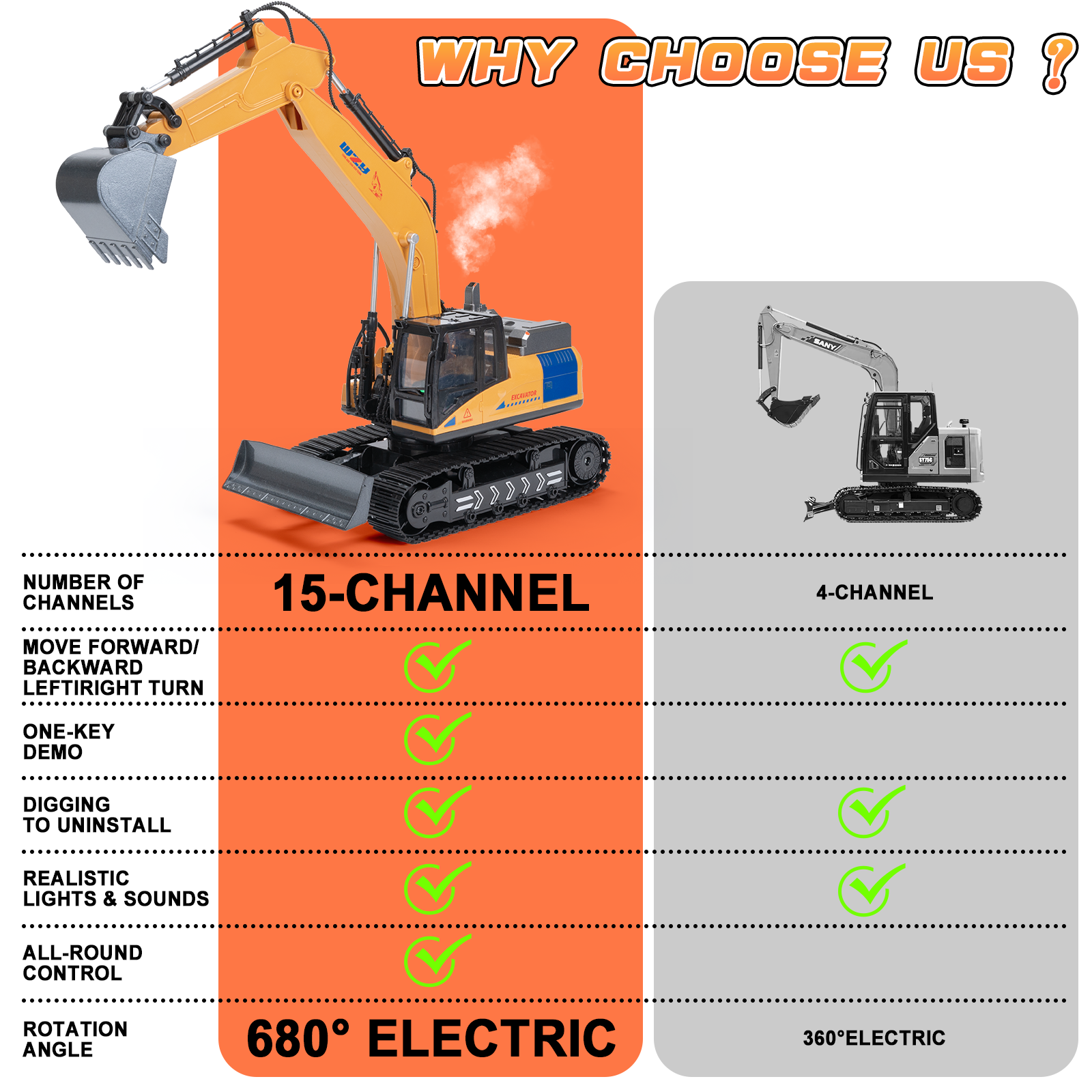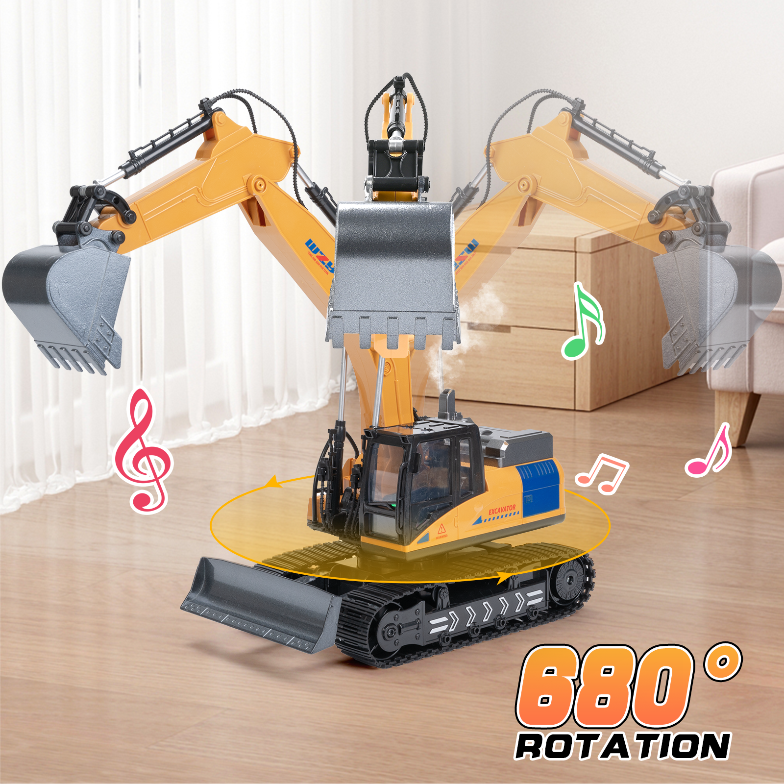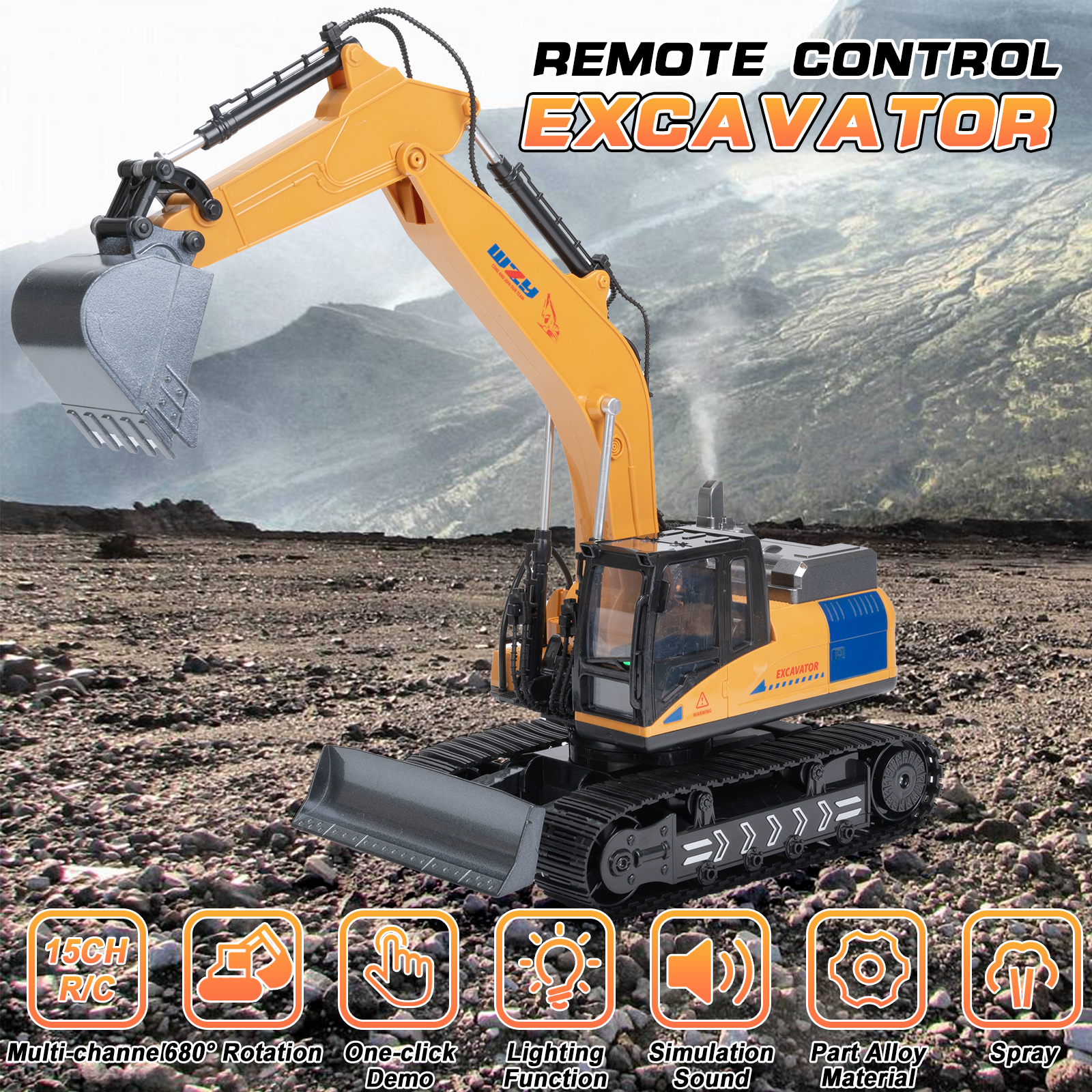 - 【15 Channel Rich functions-Remote control excavator toy is fully functional equipped, can be moved back and forth, left and right. The cab can be rotated 680 degrees, the excavator toy can really dig and shovel with sounds, spray and lights and move upper and lower arms/forward/backward/left/right. Auto demonstration also help little kids better operate and increase their interest in construction toys.