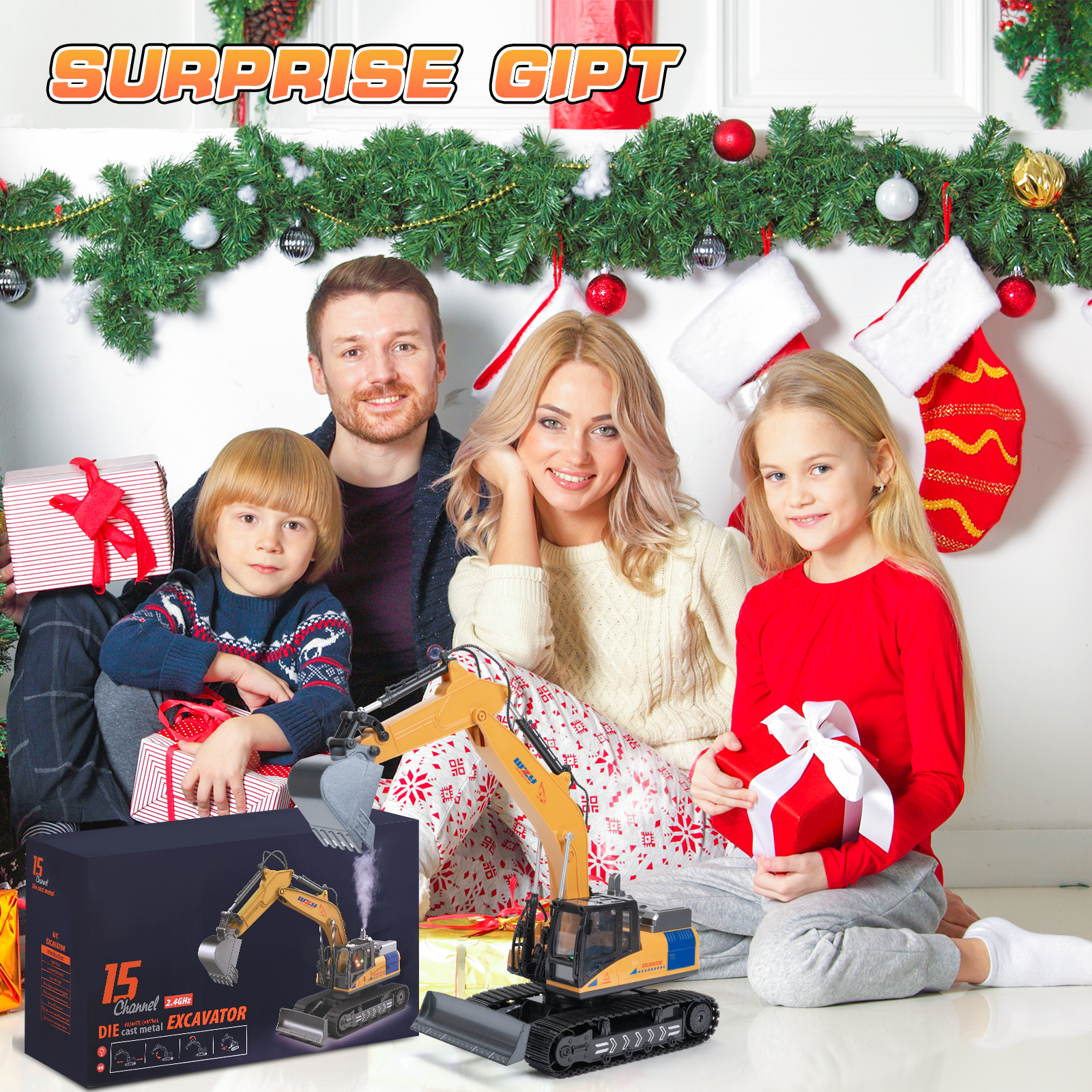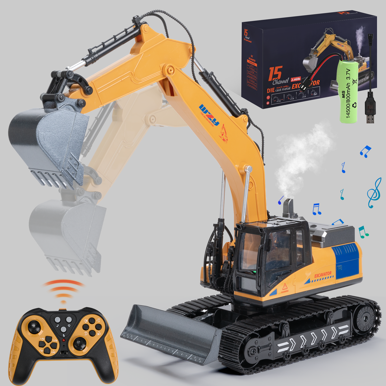 Remote Control Excavator, 15 Channel RC Construction Bulldozer Vehicles Toys with Metal Shovel, Lights, Sounds and Spraying, Gifts for Kids 3-12 Years Old