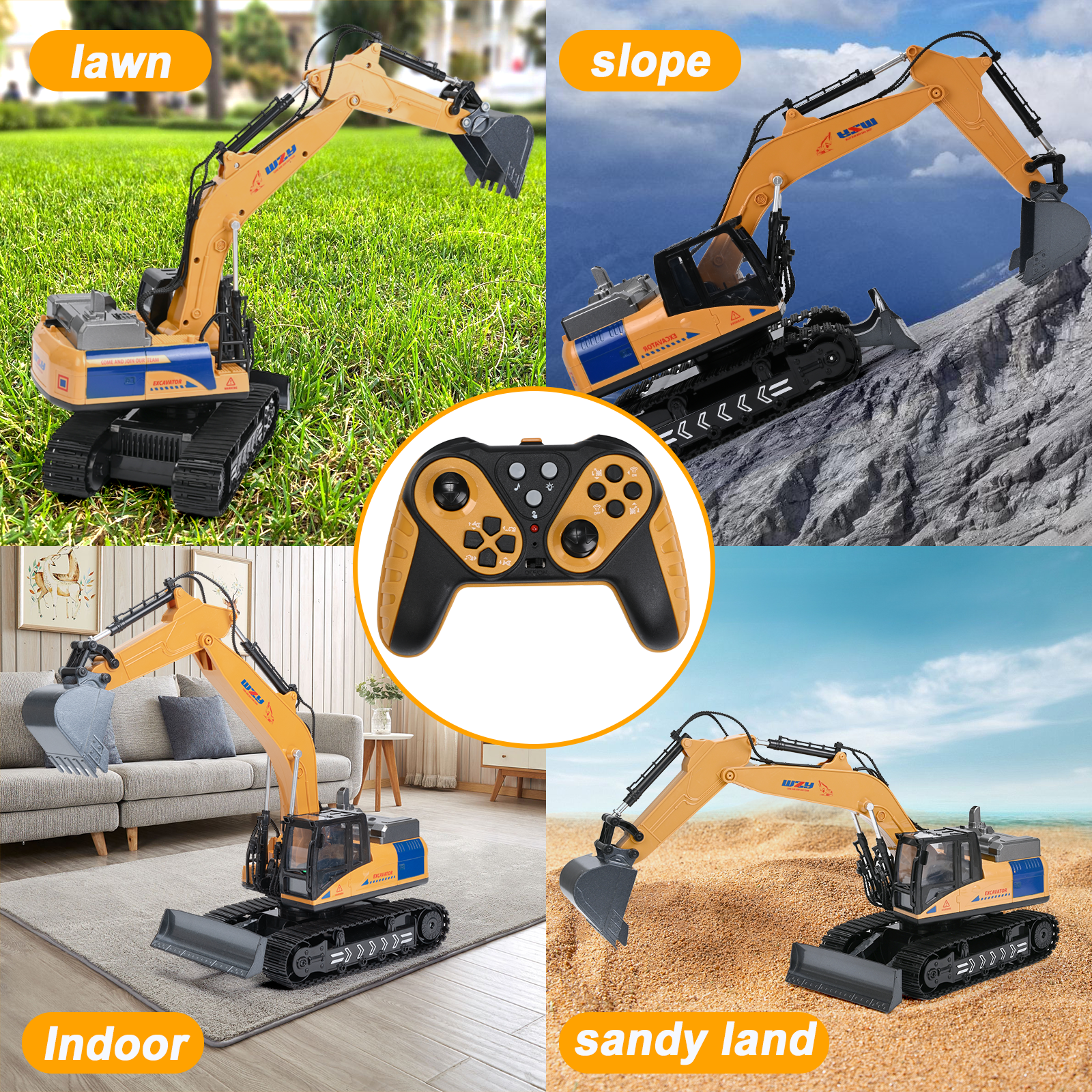 - 【2 IN 1 RC Excavator】This RC excavator can be used as a backhoe or bulldozer, equipped with a powerful motor and heavy-duty rubber tracked tires for smooth driving in a variety of terrains, including sand, grass, gravel roads and more. Kids can play anywhere indoors or outdoors.