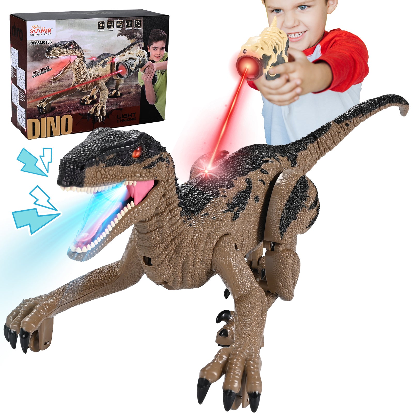 【Realistic Roaring Dinosaur Toy】: Press the button on the remote control to shooting light to mark the target, and the dinosaur will raise its legs, swing its tail, walk like a real dinosaur, automatically spray from its mouth as well as spark light, and make realistic roaring dinosaur sounds. Allows you to play dinosaur versus game with your friends.